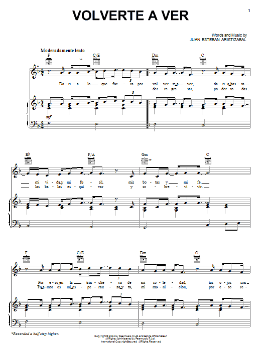 Download or print Juan Esteban Aristizabal Volverte A Ver sheet music, chords and digital score arranged for Piano, Vocal & Guitar Chords (Right-Hand Melody). This Latin score includes 5 page(s).