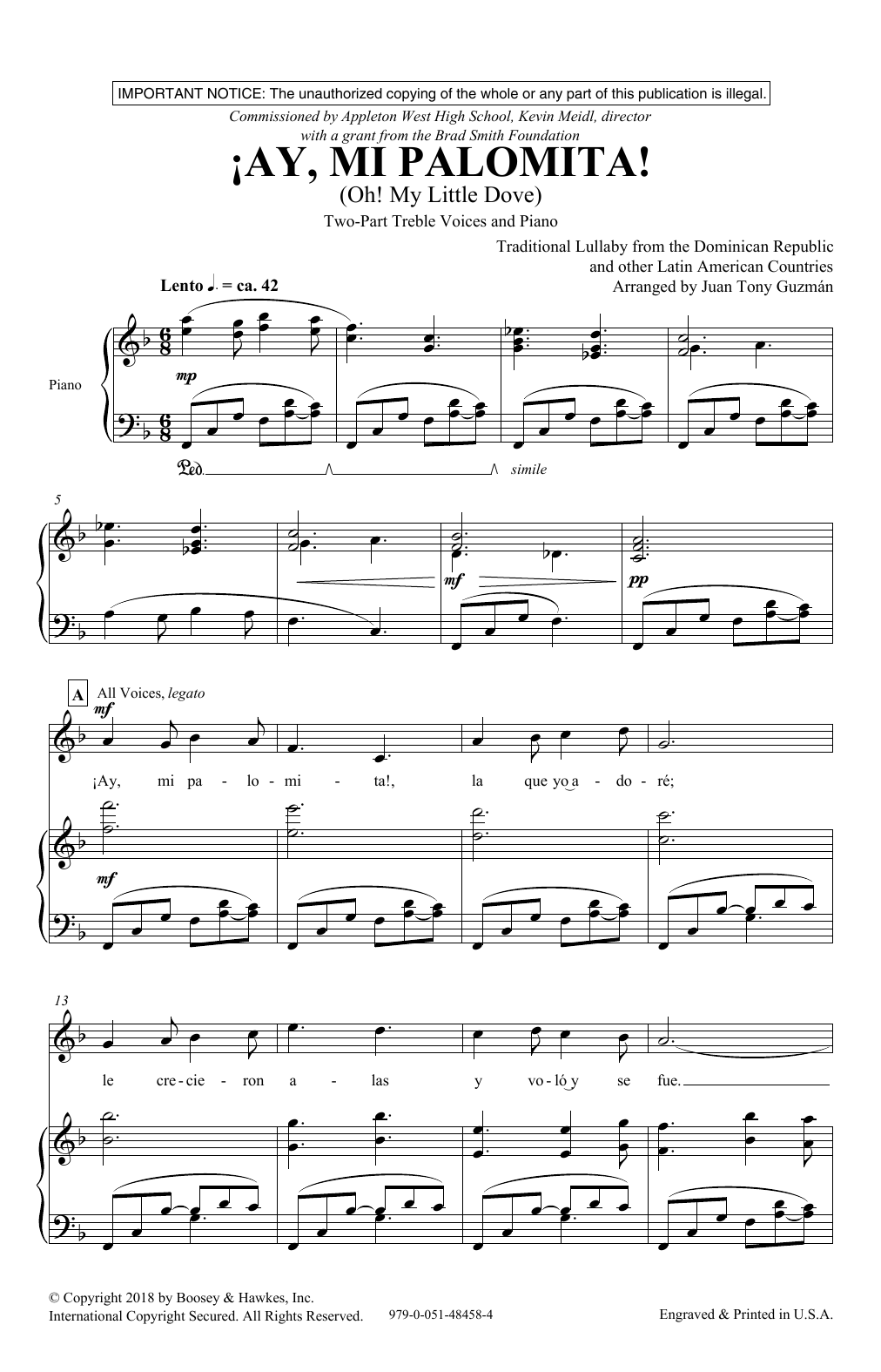 Download or print Juan-Tony Guzmán Ay! Mi Palomita (Oh! My Little Dove) sheet music, chords and digital score arranged for 2-Part Choir. This Concert score includes 6 page(s).
