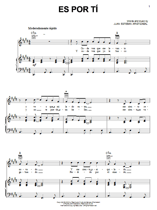 Download or print Juanes Es Por Ti sheet music, chords and digital score arranged for Piano, Vocal & Guitar Chords (Right-Hand Melody). This Latin score includes 5 page(s).