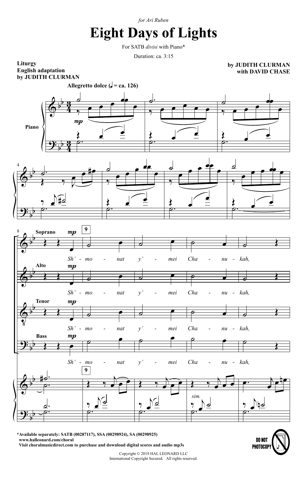 Download or print Judith Clurman with David Chase Eight Days Of Lights sheet music, chords and digital score arranged for 2-Part Choir. This Holiday score includes 11 page(s).