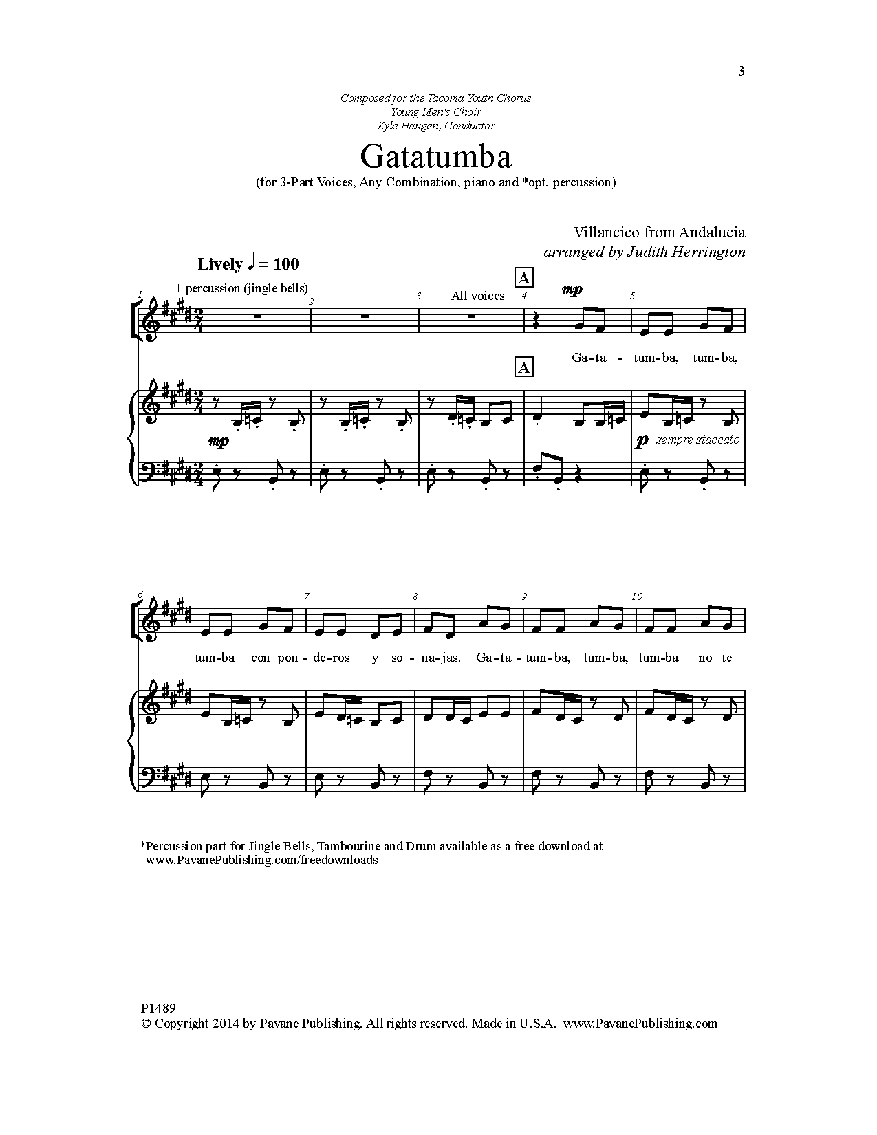 Download or print Judith Herrington Gatatumba sheet music, chords and digital score arranged for 3-Part Mixed Choir. This Concert score includes 7 page(s).