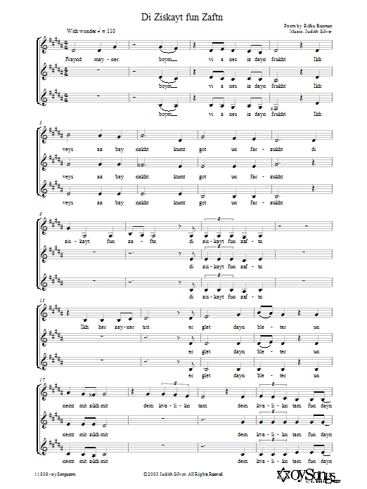 Download or print Judith Silver Di Ziskayt fun Zaftn sheet music, chords and digital score arranged for 3-Part Mixed Choir. This Pop score includes 2 page(s).