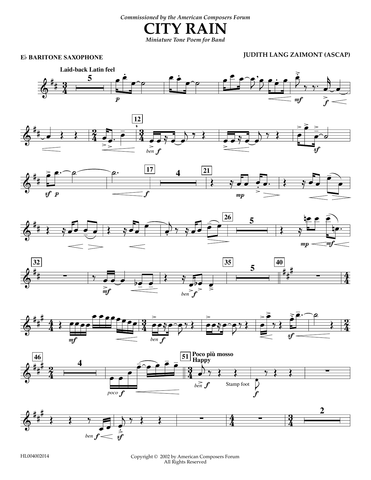 Download or print Judith Zaimont City Rain - Eb Baritone Saxophone sheet music, chords and digital score arranged for Concert Band. This Concert score includes 2 page(s).