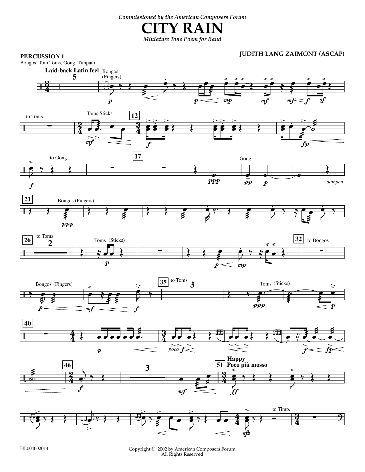 Download or print Judith Zaimont City Rain - Percussion 1 sheet music, chords and digital score arranged for Concert Band. This Concert score includes 2 page(s).