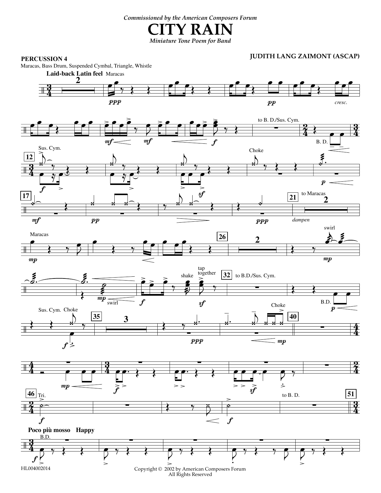 Download or print Judith Zaimont City Rain - Percussion 4 sheet music, chords and digital score arranged for Concert Band. This Concert score includes 2 page(s).