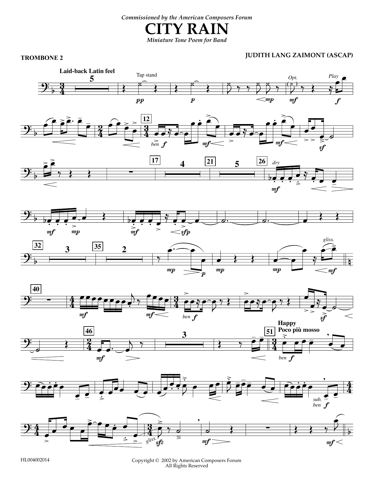 Download or print Judith Zaimont City Rain - Trombone 2 sheet music, chords and digital score arranged for Concert Band. This Concert score includes 2 page(s).