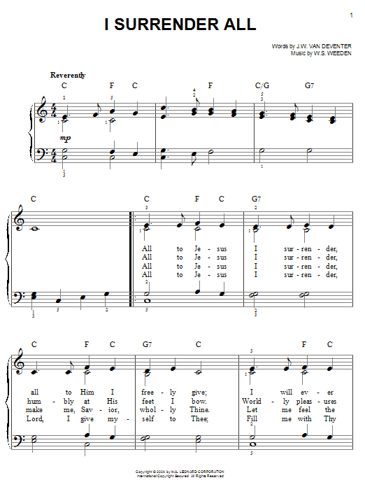 Download or print Judson W. Van De Venter I Surrender All sheet music, chords and digital score arranged for Easy Piano. This Christian score includes 2 page(s).