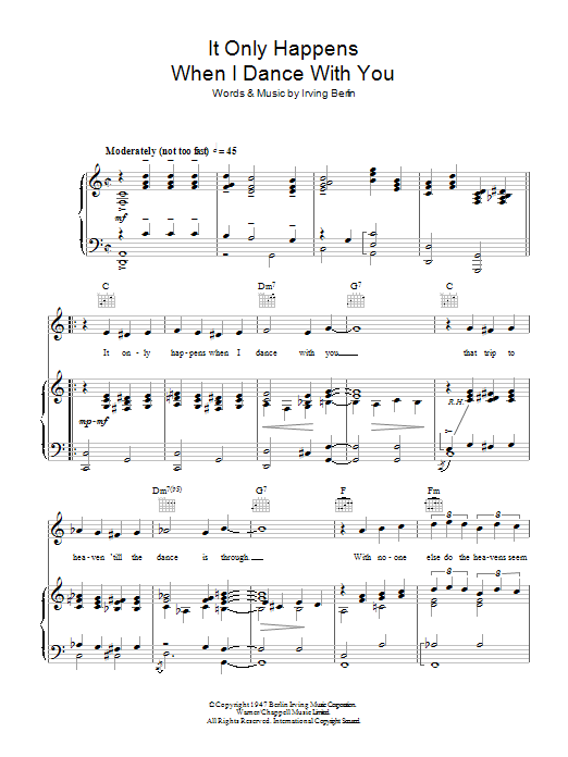 Download or print Judy Garland It Only Happens When I Dance With You sheet music, chords and digital score arranged for Piano, Vocal & Guitar Chords. This Standards score includes 3 page(s).