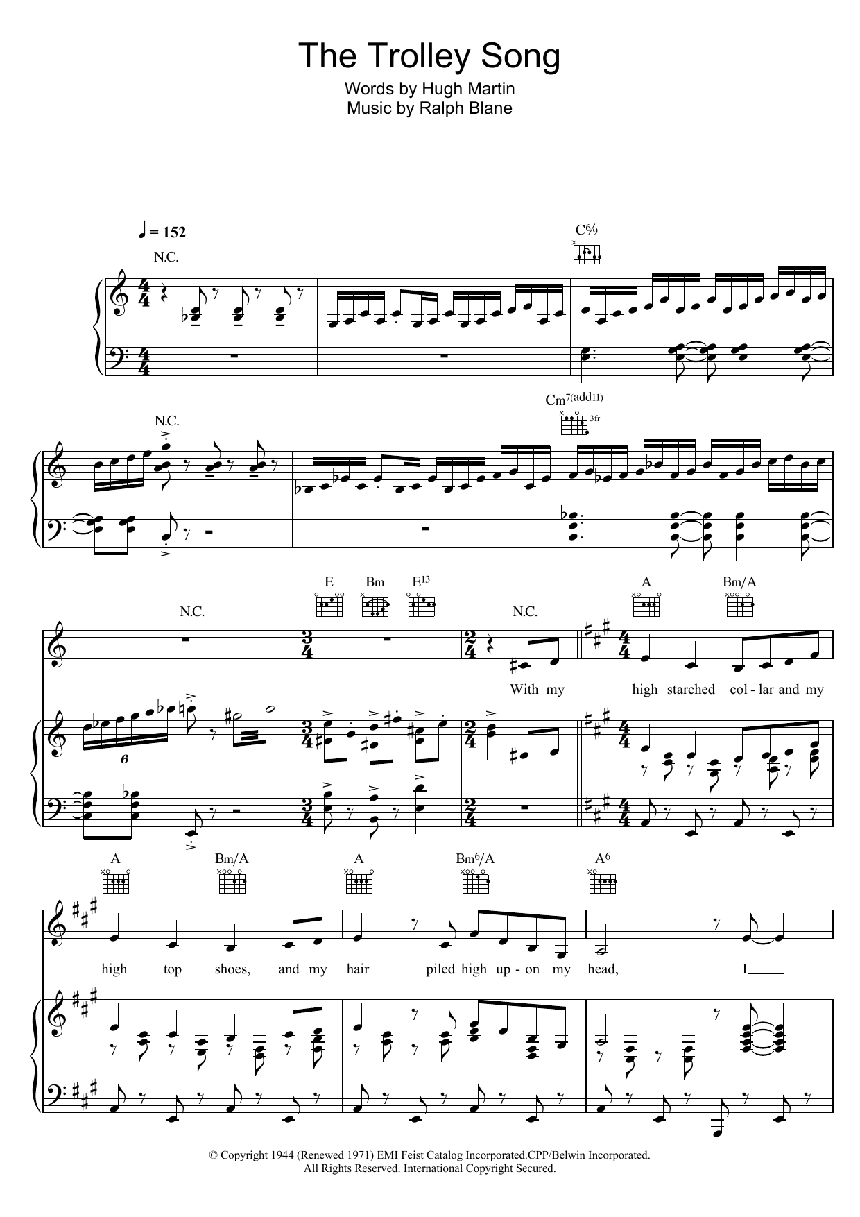 Download or print Judy Garland The Trolley Song (from Meet Me In St. Louis) sheet music, chords and digital score arranged for Easy Piano. This Jazz score includes 8 page(s).
