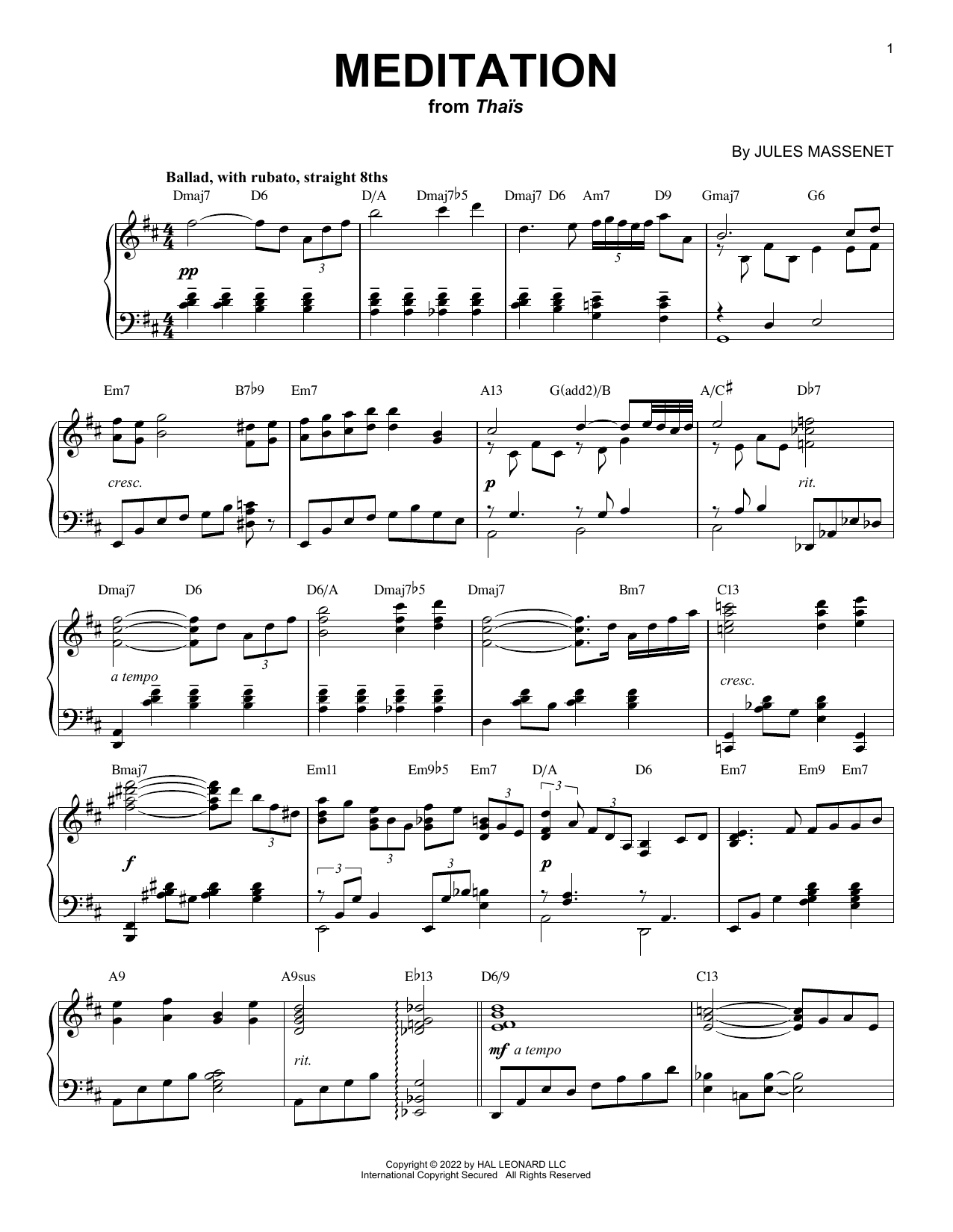 Download or print Jules Massenet Meditation [Jazz version] (arr. Brent Edstrom) sheet music, chords and digital score arranged for Piano Solo. This Classical score includes 3 page(s).