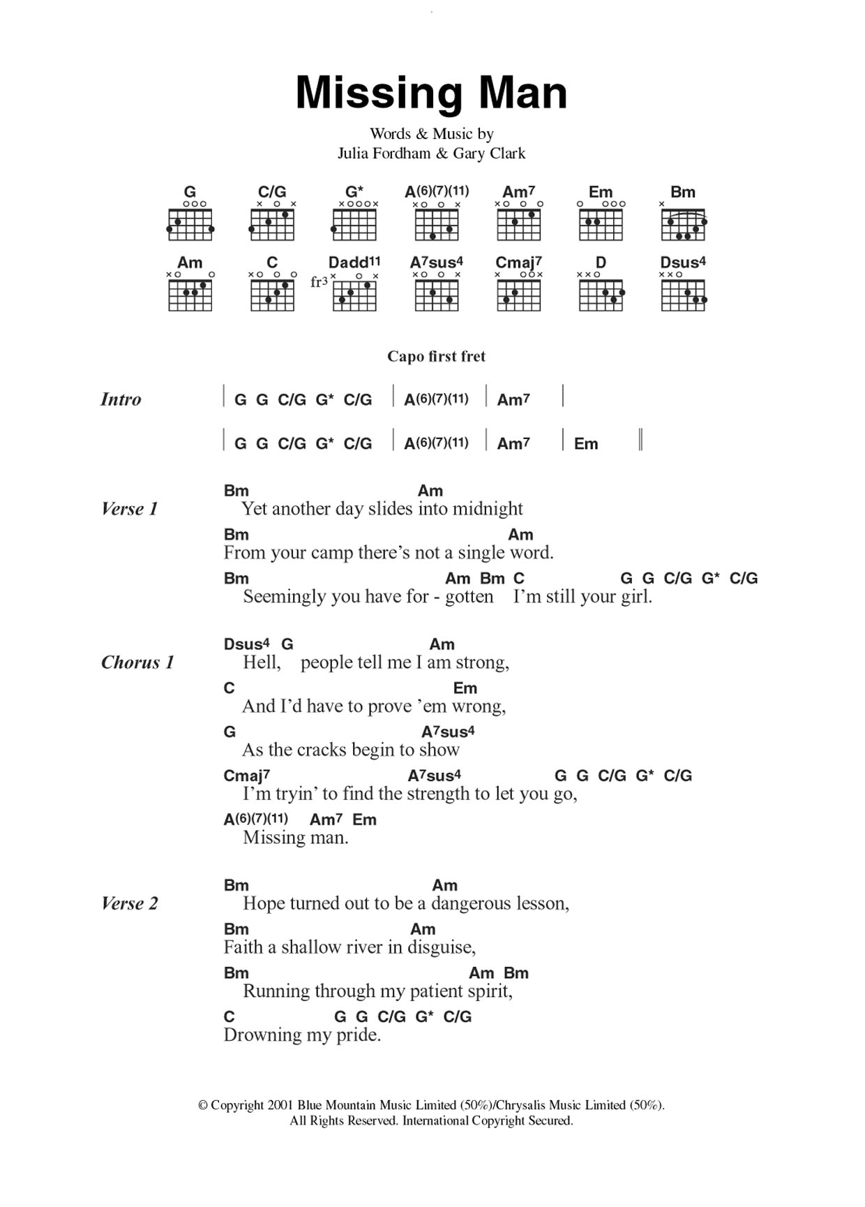 Download or print Julia Fordham Missing Man sheet music, chords and digital score arranged for Guitar Chords/Lyrics. This Pop score includes 2 page(s).