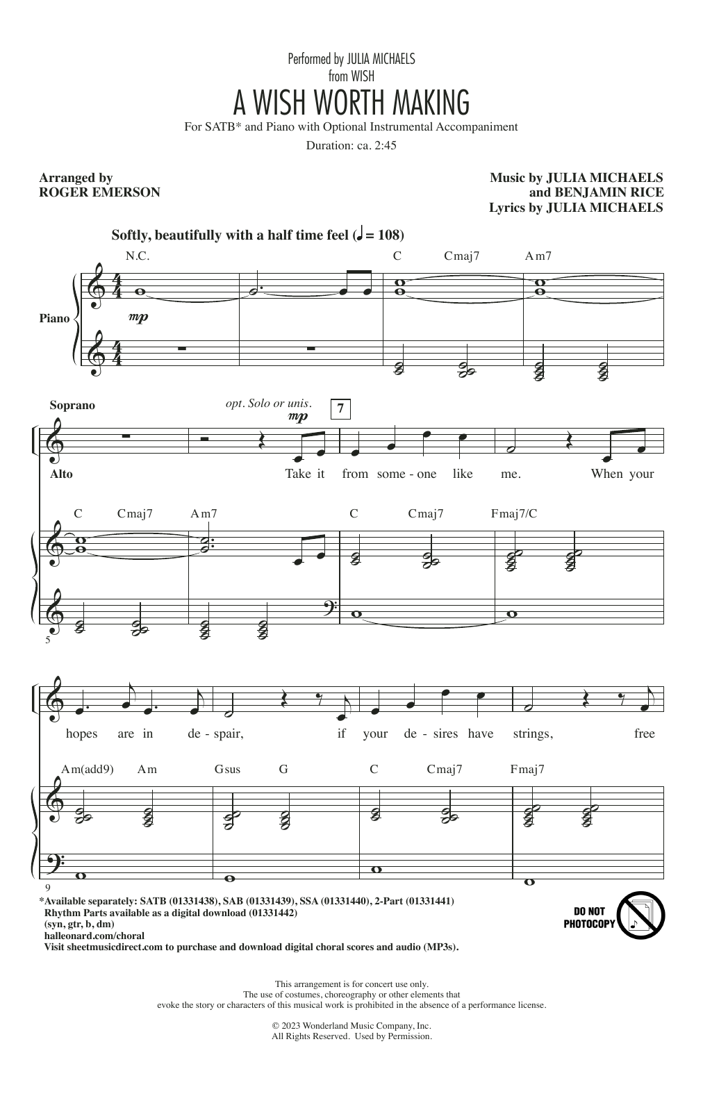 Download or print Julia Michaels A Wish Worth Making (from Wish) (arr. Roger Emerson) sheet music, chords and digital score arranged for SAB Choir. This Disney score includes 7 page(s).