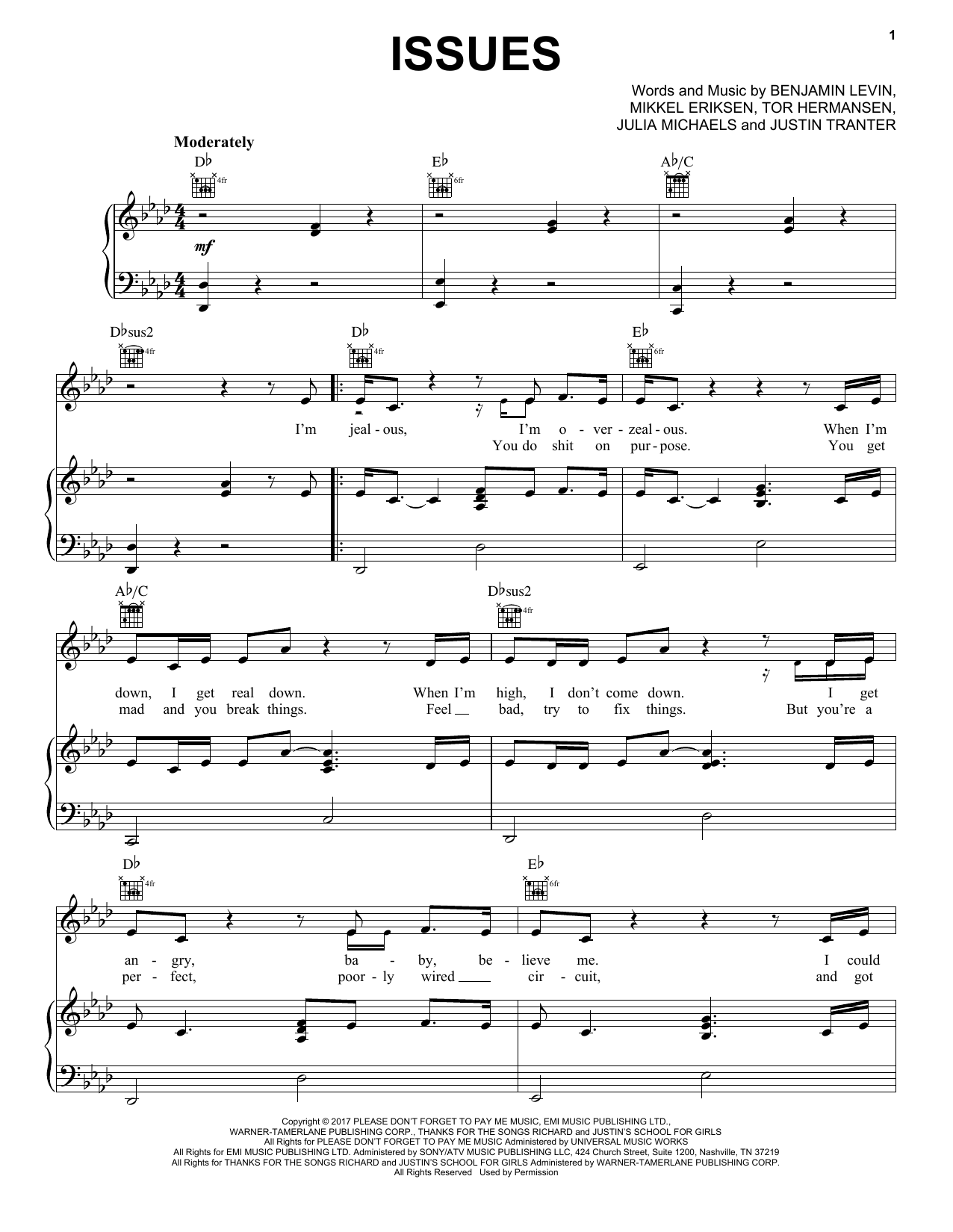 Download or print Julia Michaels Issues sheet music, chords and digital score arranged for Easy Piano. This Pop score includes 5 page(s).