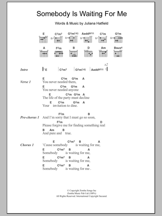 Download or print Juliana Hatfield Somebody Is Waiting For Me sheet music, chords and digital score arranged for Guitar Chords/Lyrics. This Rock score includes 2 page(s).