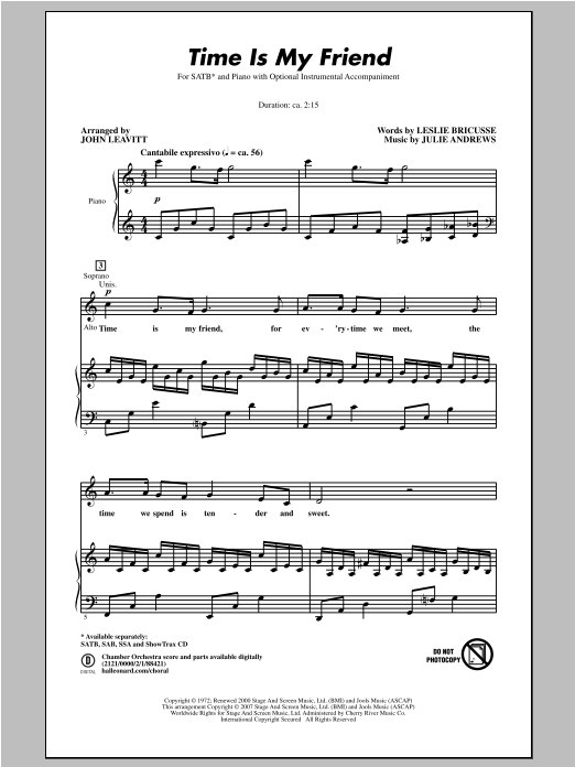 Download or print John Leavitt Time Is My Friend sheet music, chords and digital score arranged for SSA Choir. This Pop score includes 6 page(s).