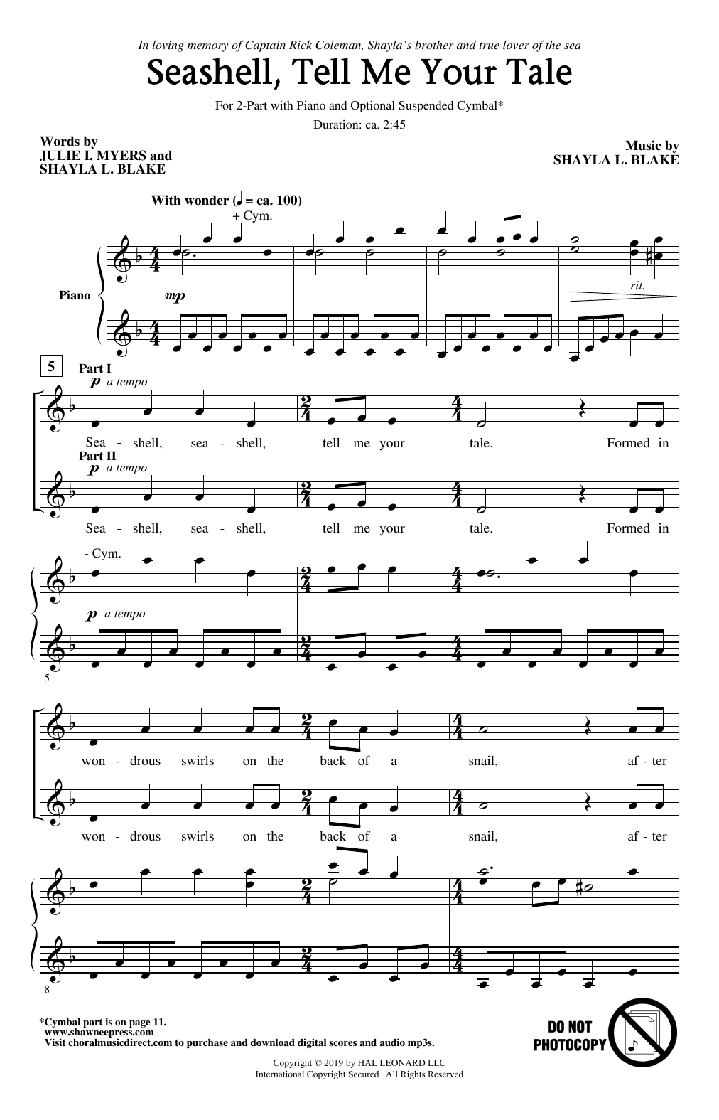 Download or print Julie I. Myers and Shayla L. Blake Seashell, Tell Me Your Tale sheet music, chords and digital score arranged for 2-Part Choir. This Concert score includes 9 page(s).