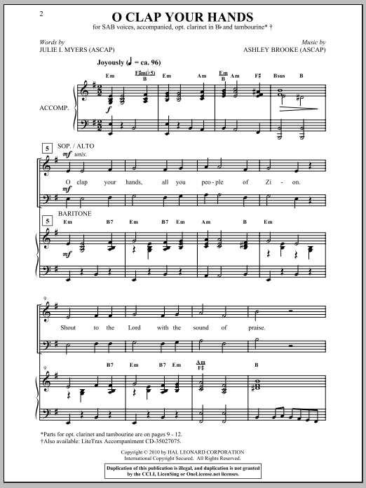 Download or print Julie I. Myers O Clap Your Hands sheet music, chords and digital score arranged for SAB Choir. This Concert score includes 6 page(s).