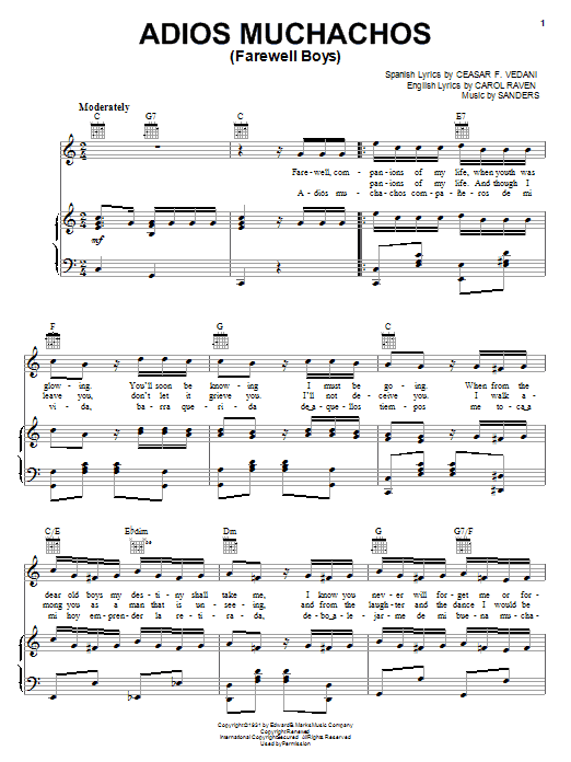 Download or print Julio Cesar Sanders Adios Muchachos (Farewell Boys) sheet music, chords and digital score arranged for Piano, Vocal & Guitar Chords (Right-Hand Melody). This Latin score includes 3 page(s).