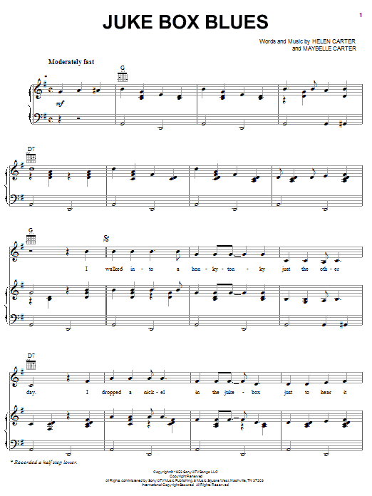 Download or print June Carter Cash Juke Box Blues sheet music, chords and digital score arranged for Piano, Vocal & Guitar Chords (Right-Hand Melody). This Country score includes 5 page(s).