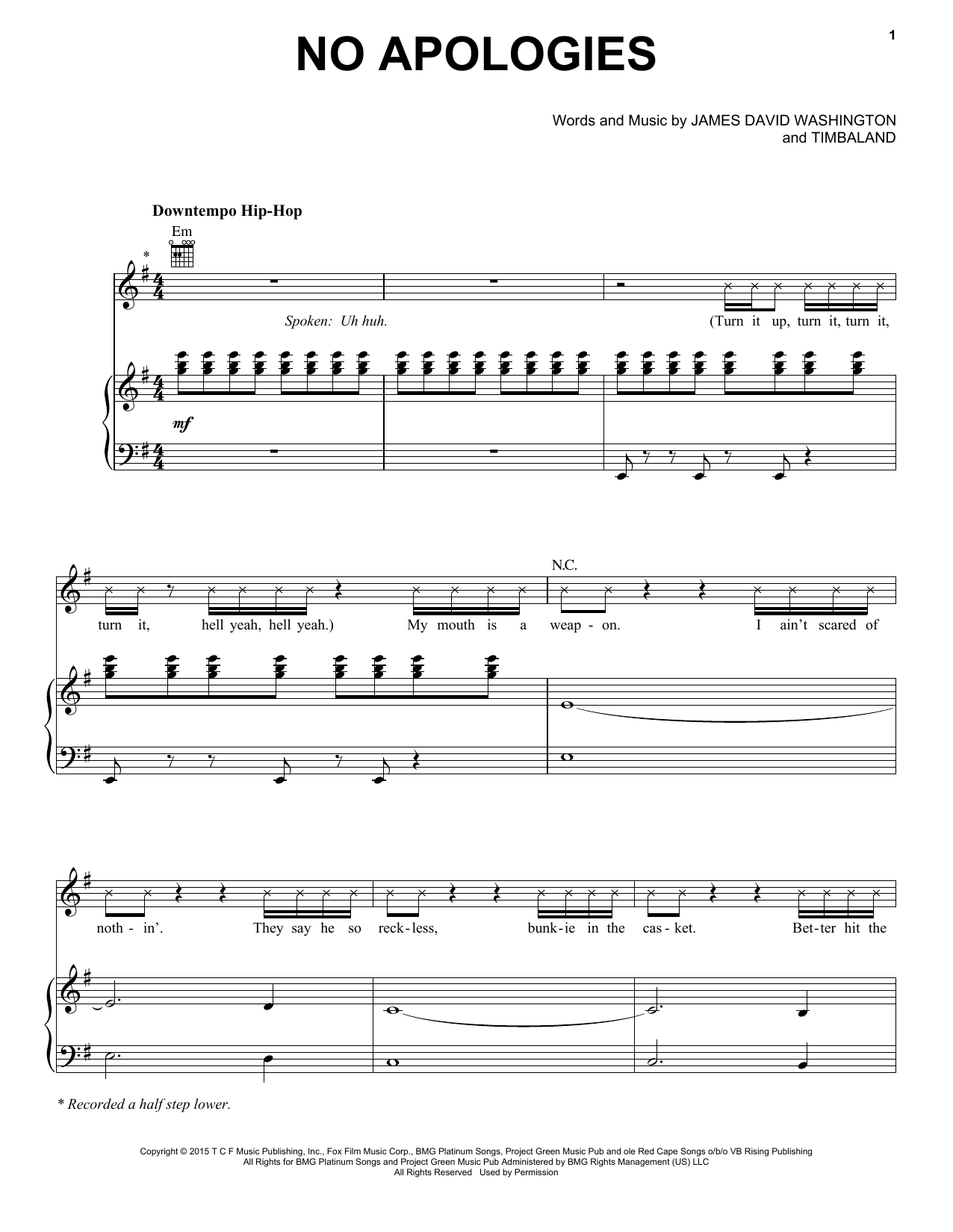 Download or print Jamal/Jussie Smollett/Hakeem/Bryshere Gray No Apologies sheet music, chords and digital score arranged for Piano, Vocal & Guitar Chords (Right-Hand Melody). This Pop score includes 7 page(s).
