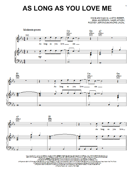 Download or print Justin Bieber As Long As You Love Me sheet music, chords and digital score arranged for Piano, Vocal & Guitar Chords (Right-Hand Melody). This Pop score includes 6 page(s).