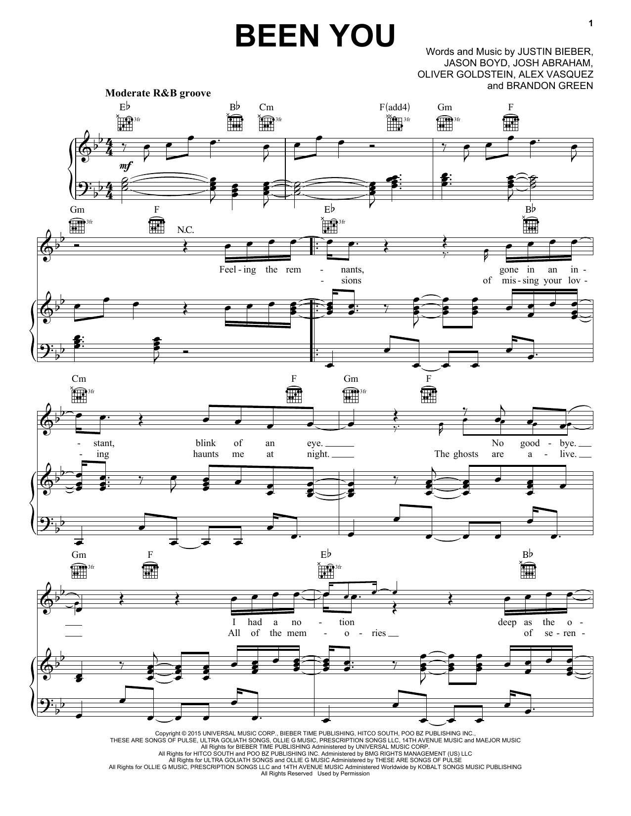 Download or print Justin Bieber Been You sheet music, chords and digital score arranged for Piano, Vocal & Guitar Chords (Right-Hand Melody). This Pop score includes 5 page(s).