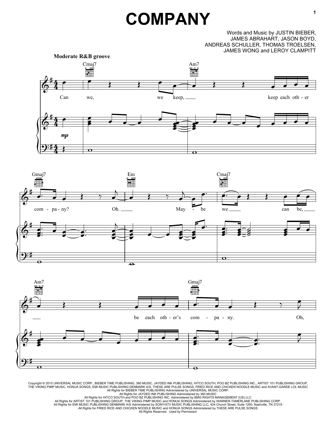 Download or print Justin Bieber Company sheet music, chords and digital score arranged for Piano, Vocal & Guitar Chords (Right-Hand Melody). This Pop score includes 6 page(s).