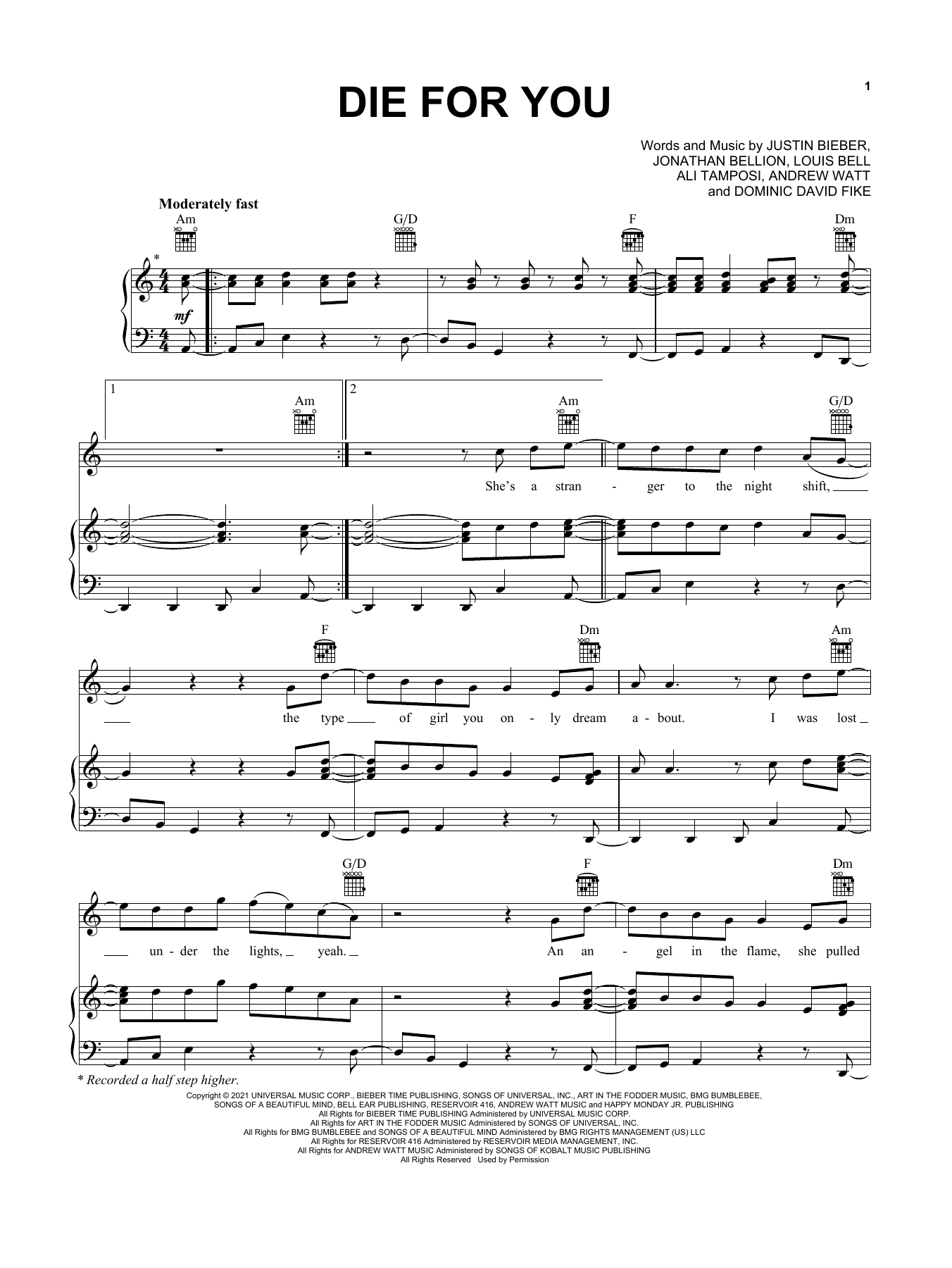 Download or print Justin Bieber Die For You (feat. Dominic Fike) sheet music, chords and digital score arranged for Piano, Vocal & Guitar Chords (Right-Hand Melody). This Pop score includes 7 page(s).