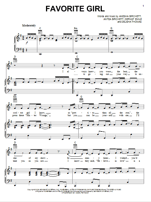 Download or print Justin Bieber Favorite Girl sheet music, chords and digital score arranged for Piano, Vocal & Guitar Chords (Right-Hand Melody). This Pop score includes 6 page(s).