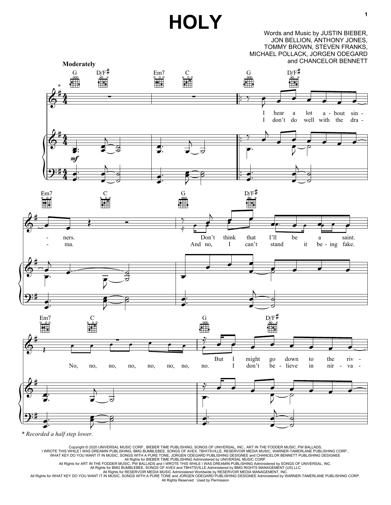 Download or print Justin Bieber Holy (feat. Chance the Rapper) sheet music, chords and digital score arranged for Easy Piano. This Pop score includes 7 page(s).