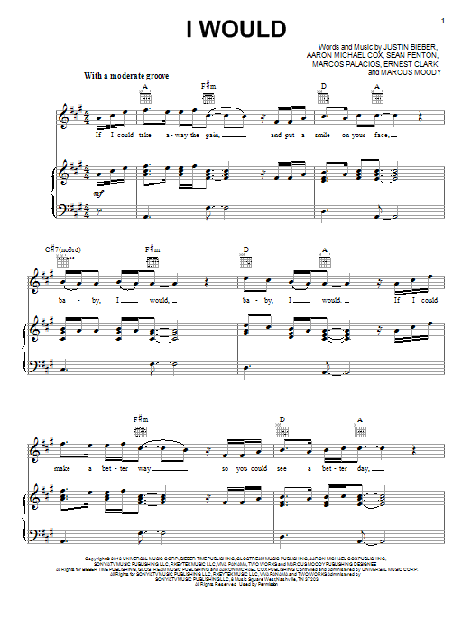 Download or print Justin Bieber I Would sheet music, chords and digital score arranged for Piano, Vocal & Guitar Chords (Right-Hand Melody). This Pop score includes 6 page(s).