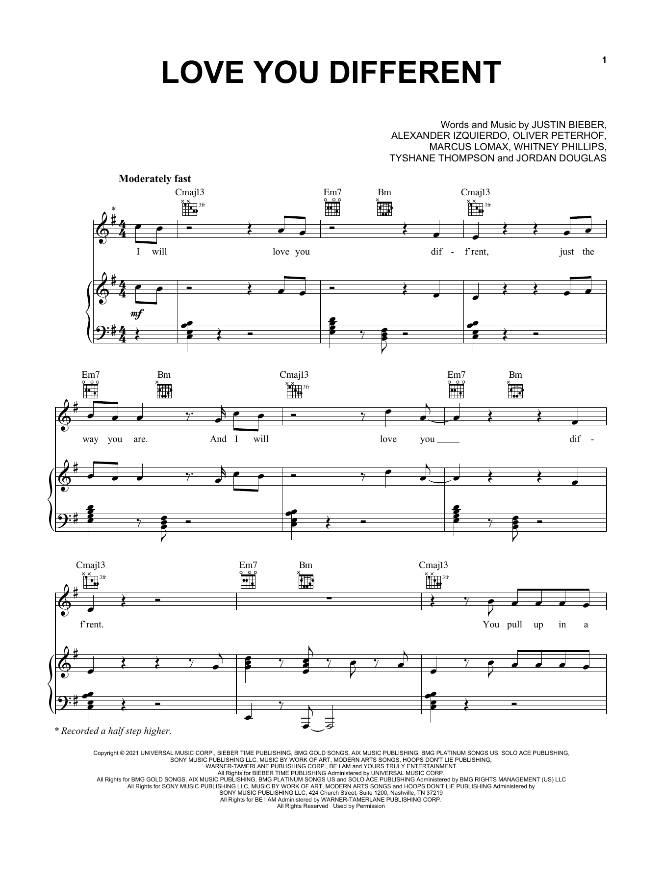 Download or print Justin Bieber Love You Different (feat. BEAM) sheet music, chords and digital score arranged for Piano, Vocal & Guitar Chords (Right-Hand Melody). This Pop score includes 7 page(s).