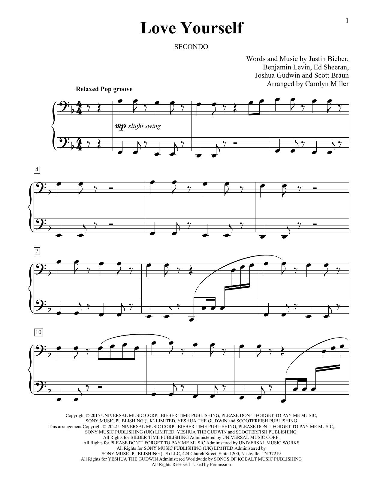 Download or print Justin Bieber Love Yourself (arr. Carolyn Miller) sheet music, chords and digital score arranged for Piano Duet. This Pop score includes 8 page(s).