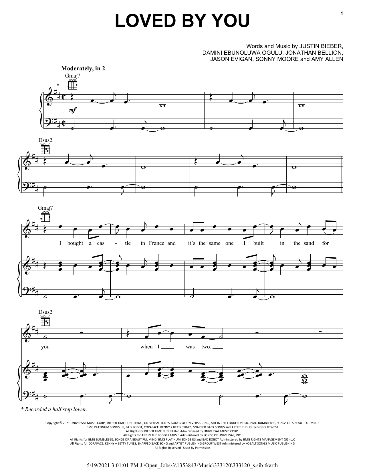 Download or print Justin Bieber Loved By You (feat. Burna Boy) sheet music, chords and digital score arranged for Piano, Vocal & Guitar Chords (Right-Hand Melody). This Pop score includes 7 page(s).