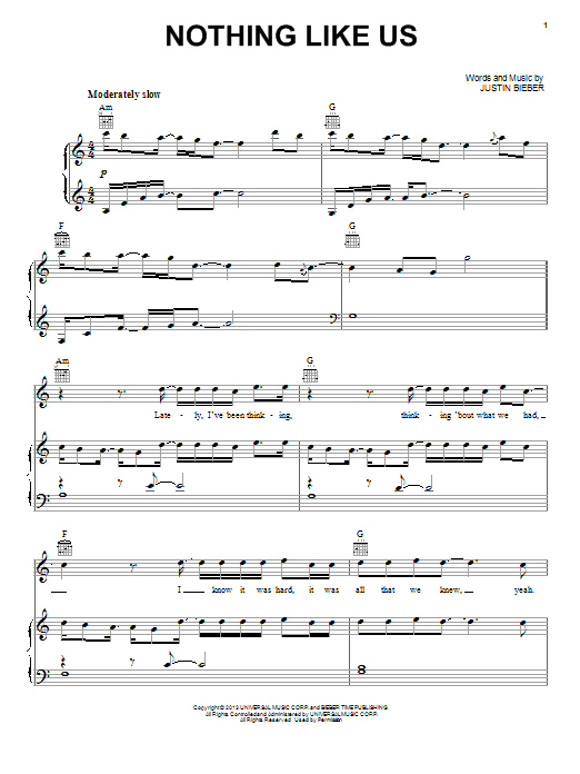 Download or print Justin Bieber Nothing Like Us sheet music, chords and digital score arranged for Easy Piano. This Pop score includes 5 page(s).