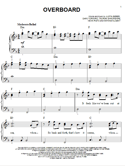 Download or print Justin Bieber Overboard sheet music, chords and digital score arranged for Easy Piano. This Pop score includes 7 page(s).