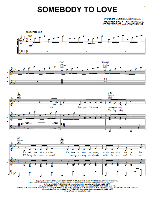 Download or print Justin Bieber Somebody To Love sheet music, chords and digital score arranged for Piano, Vocal & Guitar Chords (Right-Hand Melody). This Pop score includes 7 page(s).