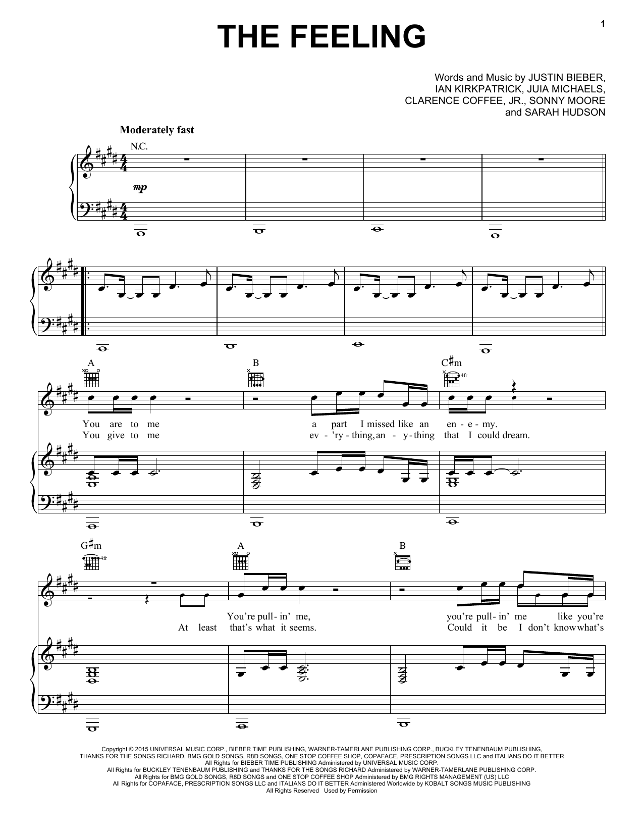 Download or print Justin Bieber The Feeling sheet music, chords and digital score arranged for Piano, Vocal & Guitar Chords (Right-Hand Melody). This Pop score includes 6 page(s).