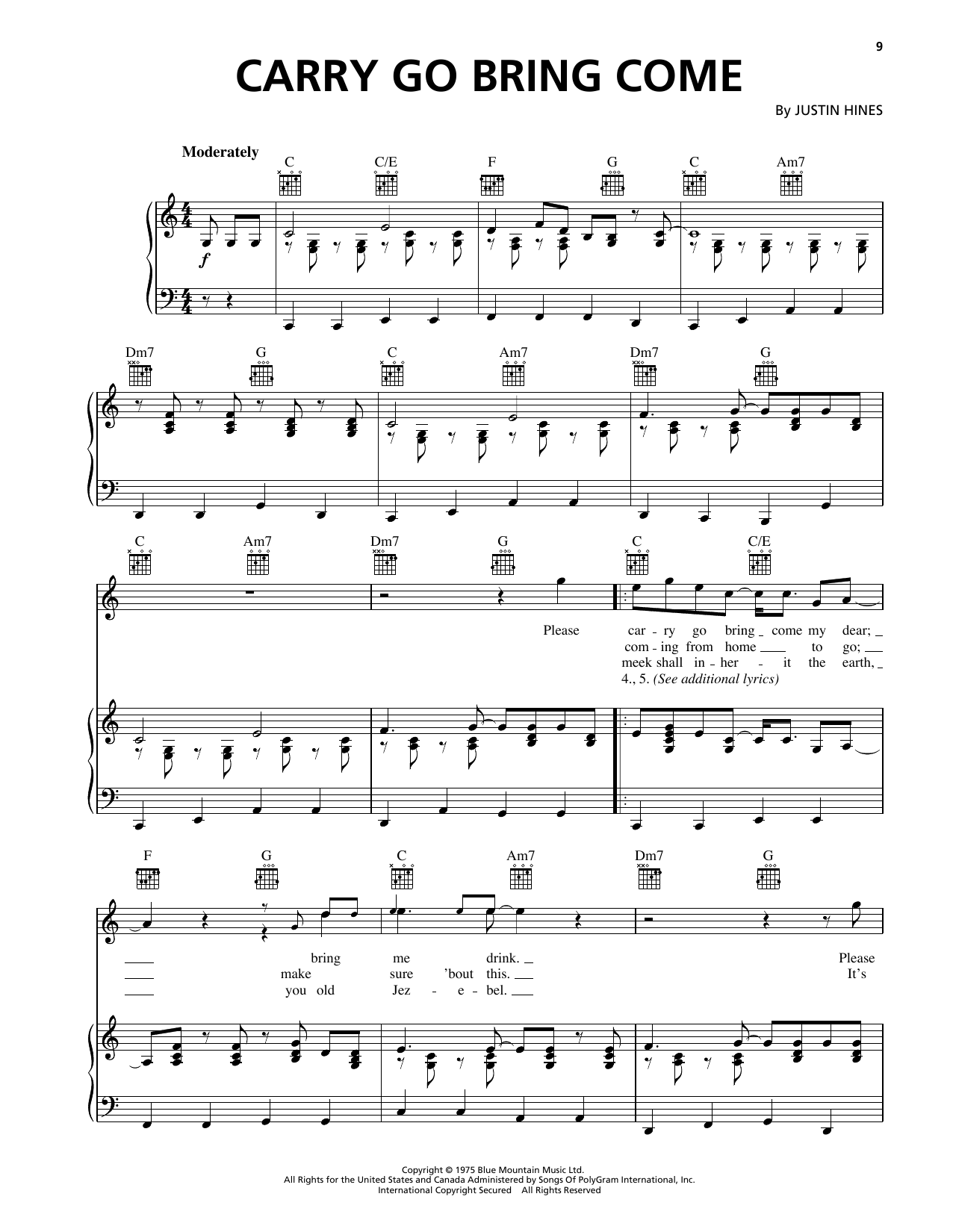 Download or print Justin Hinds Carry Go Bring Come sheet music, chords and digital score arranged for Piano, Vocal & Guitar Chords (Right-Hand Melody). This Reggae score includes 3 page(s).