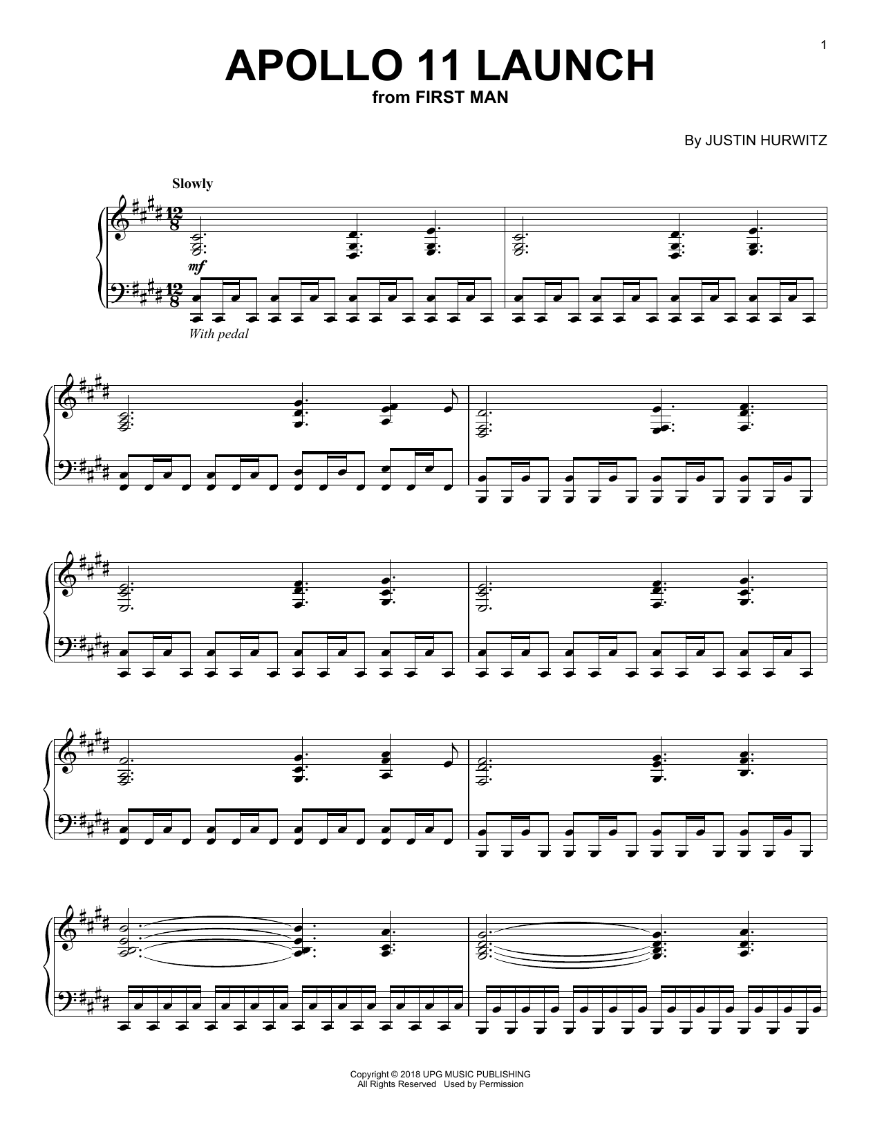 Download or print Justin Hurwitz Apollo 11 Launch (from First Man) sheet music, chords and digital score arranged for Piano Solo. This Pop score includes 4 page(s).