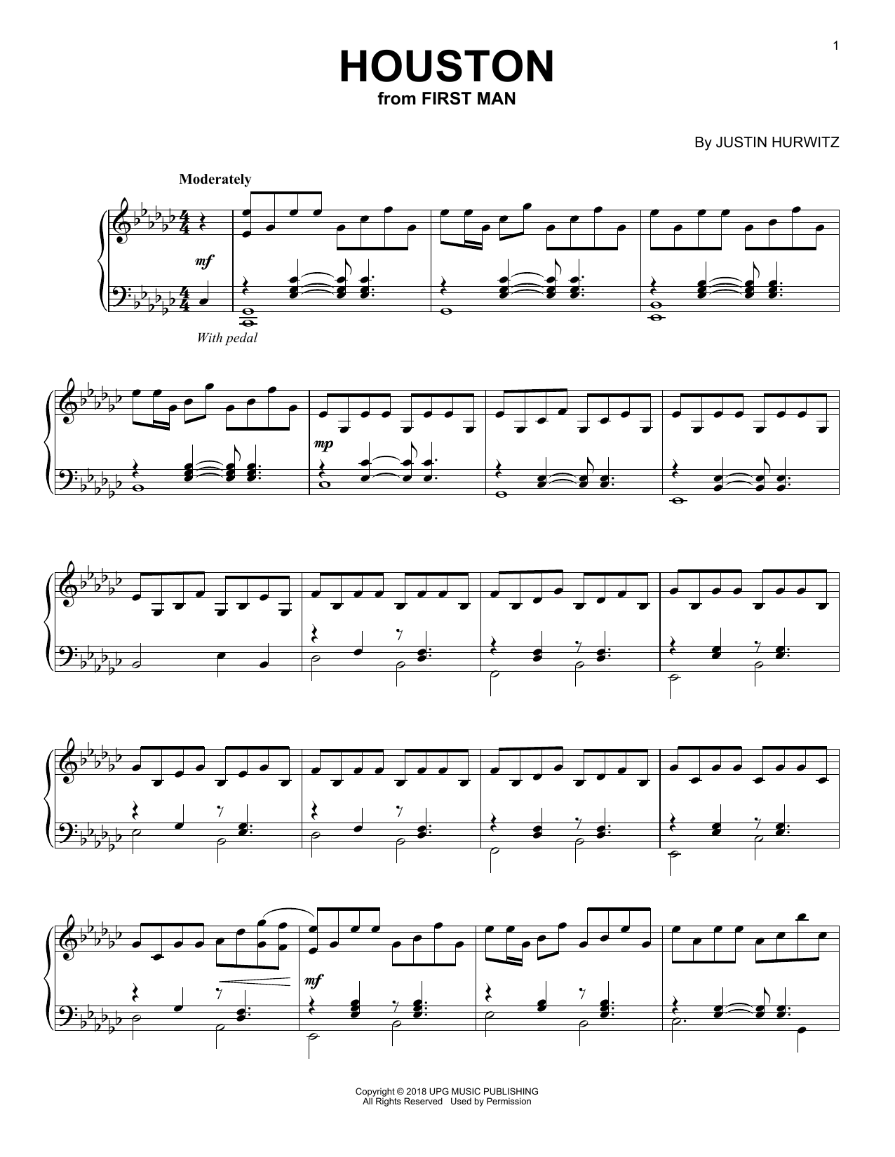 Download or print Justin Hurwitz Houston (from First Man) sheet music, chords and digital score arranged for Piano Solo. This Pop score includes 3 page(s).