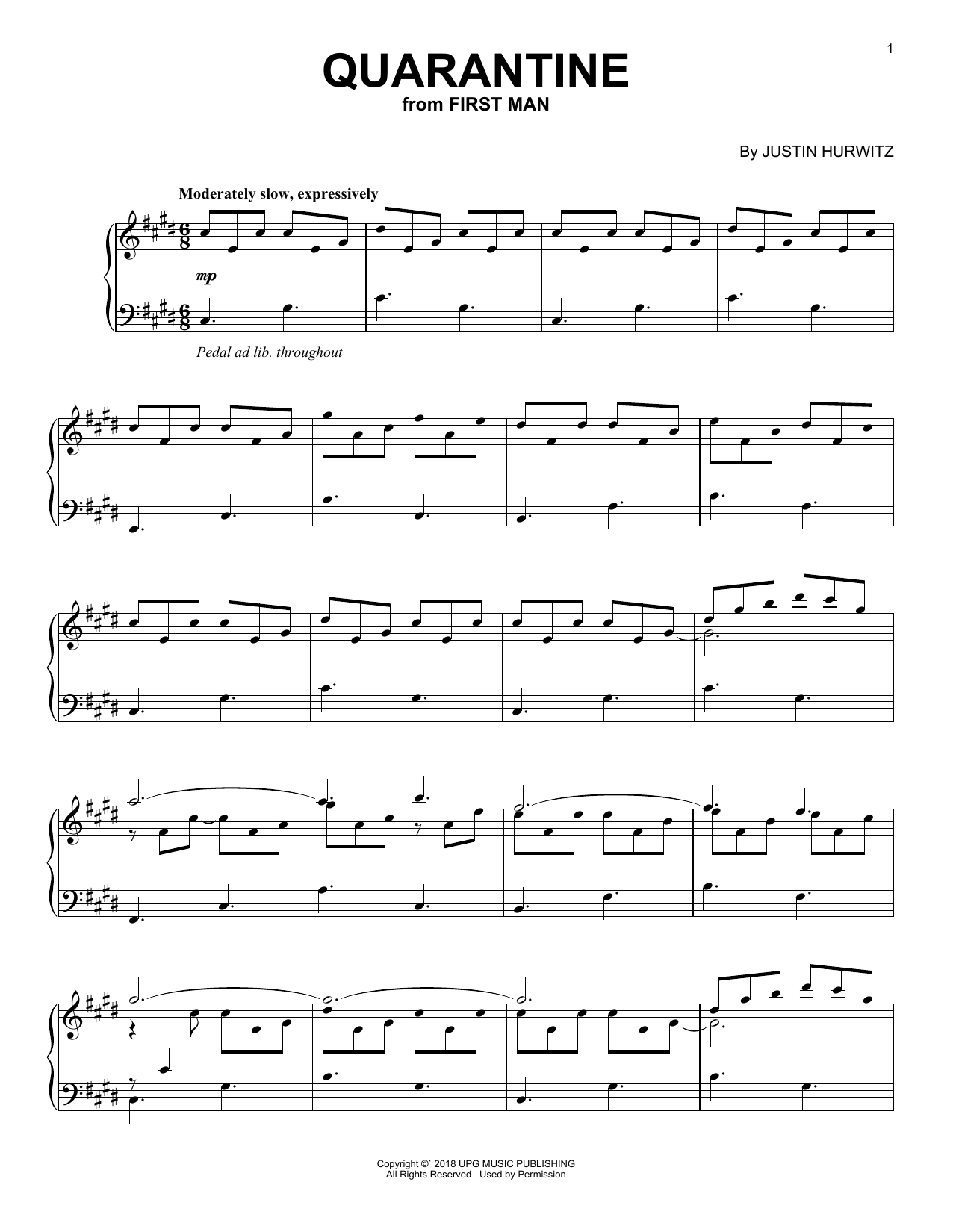 Download or print Justin Hurwitz Quarantine (from First Man) sheet music, chords and digital score arranged for Piano Solo. This Pop score includes 3 page(s).