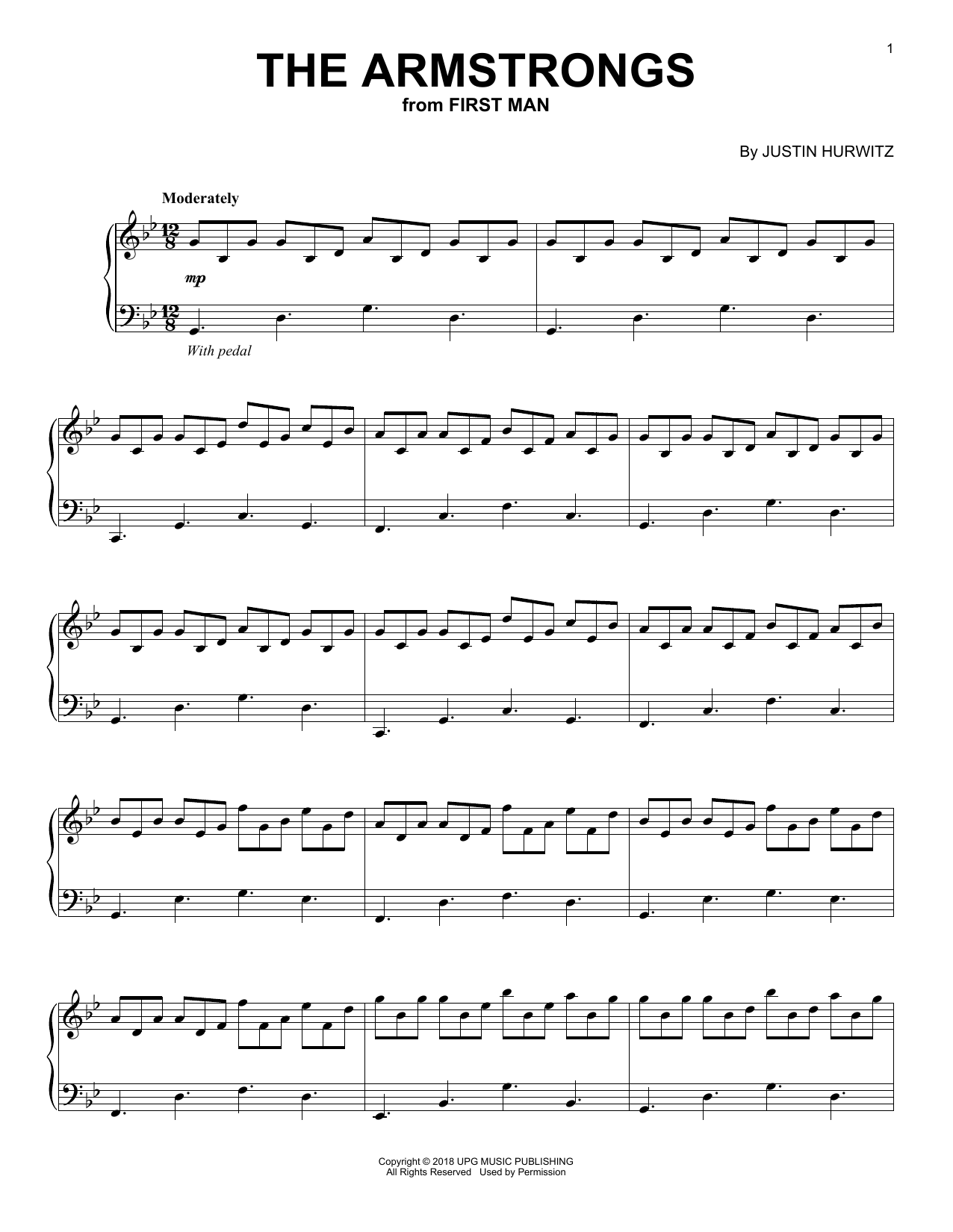 Download or print Justin Hurwitz The Armstrongs (from First Man) sheet music, chords and digital score arranged for Piano Solo. This Pop score includes 3 page(s).