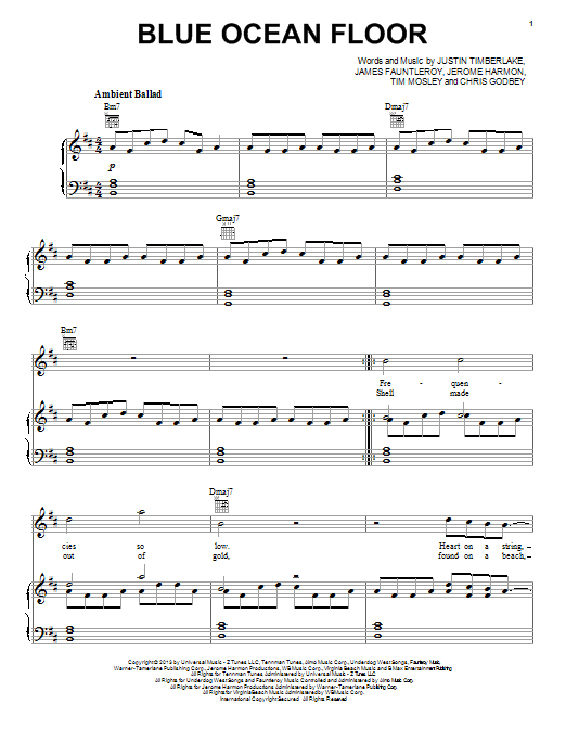 Download or print Justin Timberlake Blue Ocean Floor sheet music, chords and digital score arranged for Piano, Vocal & Guitar Chords (Right-Hand Melody). This Pop score includes 7 page(s).