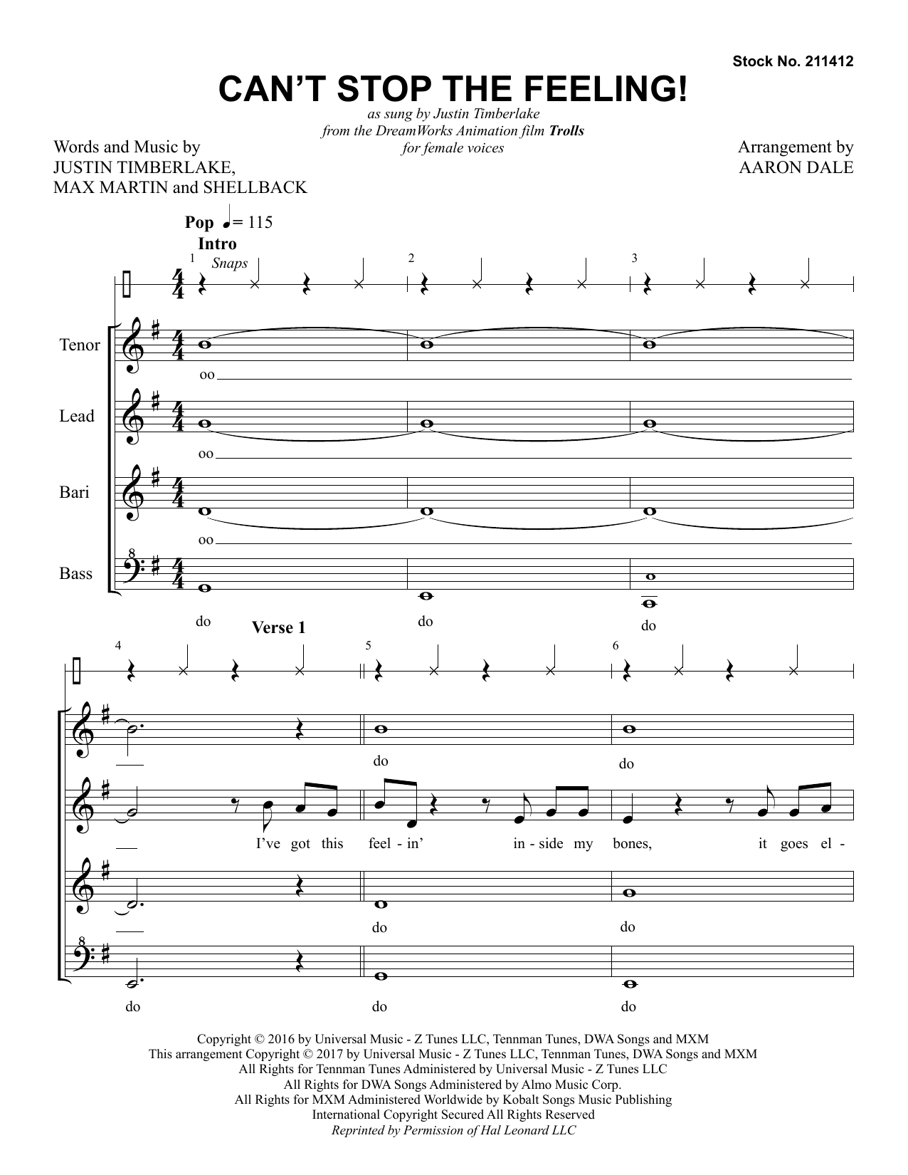 Download or print Justin Timberlake Can't Stop the Feeling! (arr. Aaron Dale) sheet music, chords and digital score arranged for SSAA Choir. This Barbershop score includes 20 page(s).