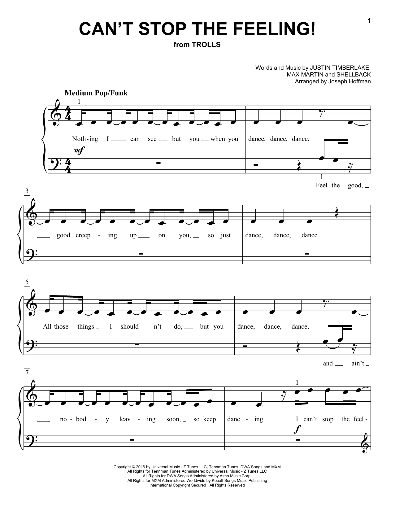 Download or print Justin Timberlake Can't Stop The Feeling! (from Trolls) (arr. Joseph Hoffman) sheet music, chords and digital score arranged for Easy Piano. This Pop score includes 3 page(s).