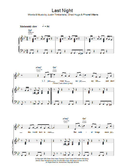 Download or print Justin Timberlake Last Night sheet music, chords and digital score arranged for Piano, Vocal & Guitar Chords. This Pop score includes 7 page(s).