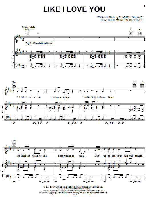 Download or print Justin Timberlake Like I Love You sheet music, chords and digital score arranged for Guitar Chords/Lyrics. This Pop score includes 4 page(s).