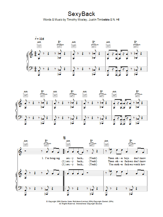 Download or print Justin Timberlake SexyBack sheet music, chords and digital score arranged for Piano, Vocal & Guitar Chords (Right-Hand Melody). This Pop score includes 7 page(s).