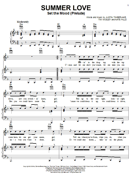 Download or print Justin Timberlake Summer Love (Set The Mood Prelude) sheet music, chords and digital score arranged for Piano, Vocal & Guitar Chords (Right-Hand Melody). This Pop score includes 8 page(s).